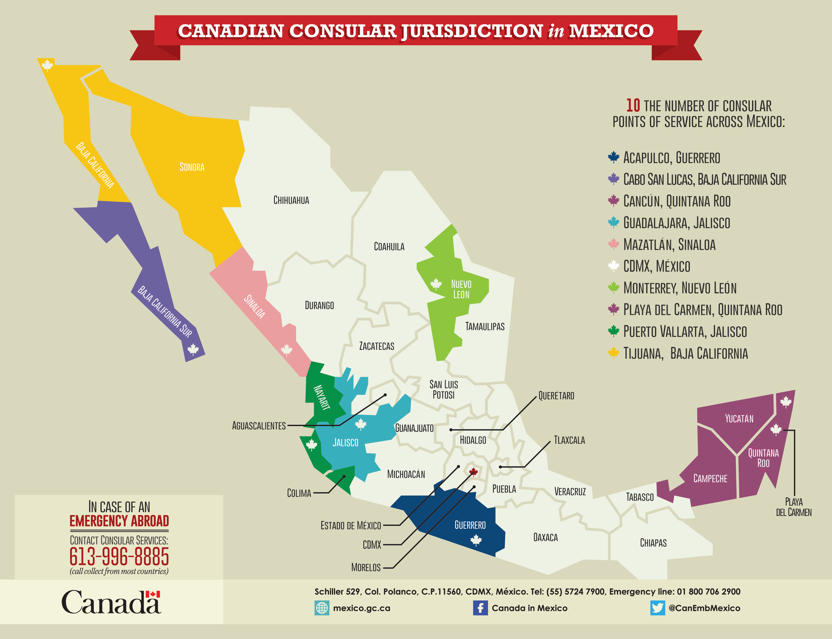 Consular District: Aguascalientes, Chiapas, Chihuahua, Coahuila, Durango, Estado de Mexico, Guanajuato, Hidalgo, Michoacán, Morelos, Mexico City, Oaxaca, Puebla, Querétaro, San Luís Potosí, Tabasco, Tamaulipas, Tlaxcala, Veracruz, Zacatecas.